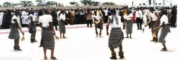 (尼日利亚的蒂夫族人穿着传统的时尚黑白条纹服饰在玩耍)
