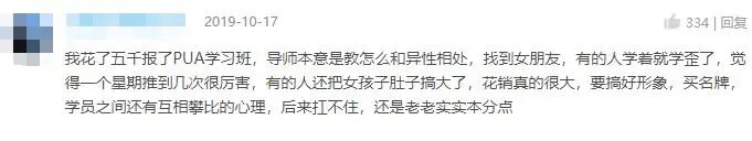 一位参加过PUA培训班的网友评论:“我花了五千报了PUA学习班,导师本意是教怎么和异性相处,找到女朋友,有的人学着就学歪了,觉得一个星期推倒几次很厉害,有的人还把女孩子肚子搞大了,花销真的很大,要搞好形象,买名牌,学员之间还有互相攀比的心理,(我)后来扛不住,还是老老实实本分点。”