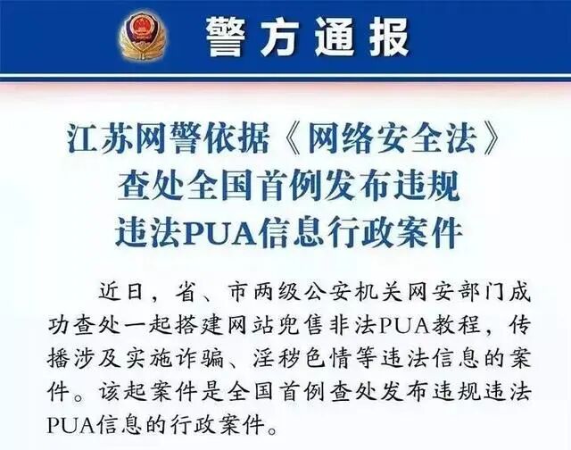 2019年5月,江苏网警通报称,成功查处全国首例发布违规违法PUA信息的行政案件。