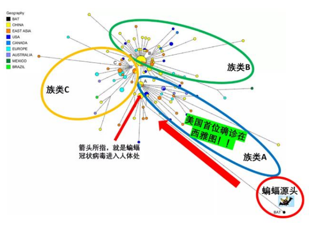 A类病毒更多发现于美国和澳洲的受感染者。A类在武汉只有极少案例,且来源于在武汉生活过的美国人。A类和从蝙蝠、穿山甲身上提取的病毒最为相似。研究人员称A类病毒为“爆发根源”(“the root of the outbreak”)。