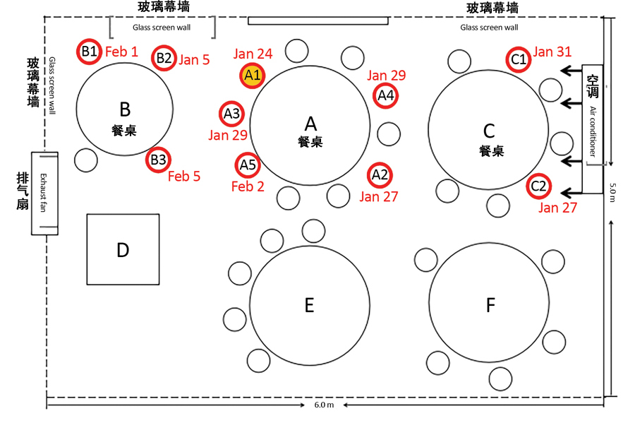 调查发现,B和C家庭中受感染人员的唯一已知接触传染源是餐厅中的患者A1。