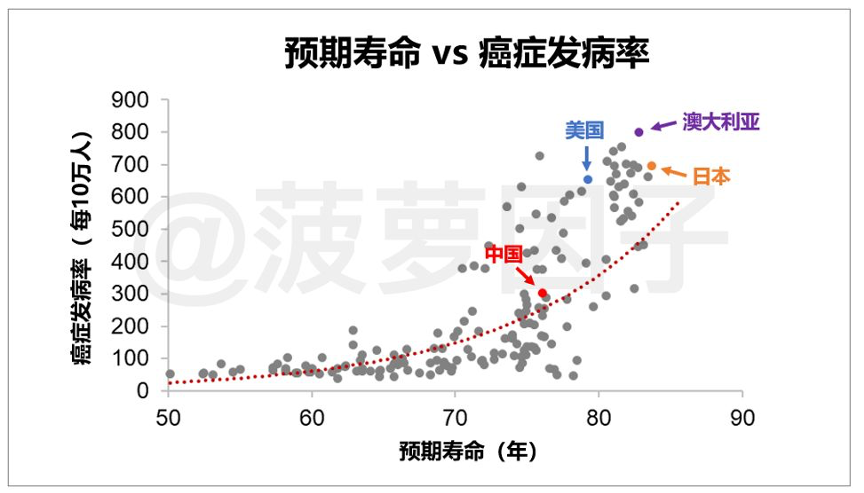 因为长寿是好事,如果活到100岁得了癌症并不值得担心。所以比较癌症绝对发病率的数字意义不大,甚至是一种误导。