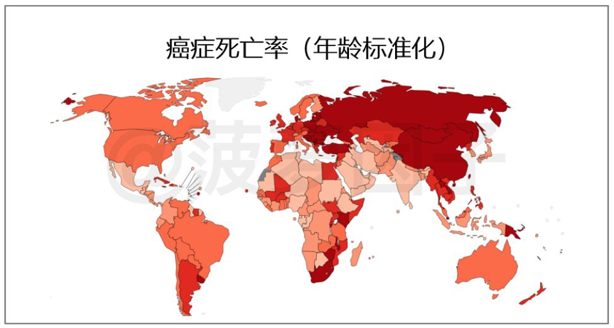 从下图可以看出,中国是全球癌症死亡率最高的国家之一(排名第12)。而日本的颜色不仅比中国浅,也比很多欧美国家浅。