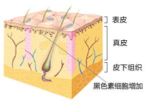 先来了解下我们皮肤的颜色是如何形成的。皮肤的结构从外至内分为表皮层、真皮层和皮下脂肪层,其中在表皮层的最下层——基底细胞层存在着数量不等的黑素细胞,这种细胞能够产生决定我们肤色的最主要的色素集团——黑素颗粒。欧美人群的皮肤中黑素细胞的含量极低,甚至缺如,因此他们看上去很白,而非洲人种的黑素细胞含量多、密度高、功能活跃,肤色自然就是黝黑色的。我们多数亚洲人的肤色介于两者之间,但是由于遗传、紫外线照射、年龄、内分泌等一些因素的作用,黑素细胞异常活跃,在局部分泌产生更多的黑素颗粒,那么,这时候的皮肤看上去就会有一片片的色素斑了,如常见的雀斑、晒斑、黄褐斑等,天生遗传的均匀小麦肤色不在今天讨论的范围之内。